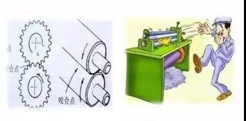 對(duì)向旋轉(zhuǎn)部件的咬合處。如齒輪、軋鋼機(jī)、混合輥等。