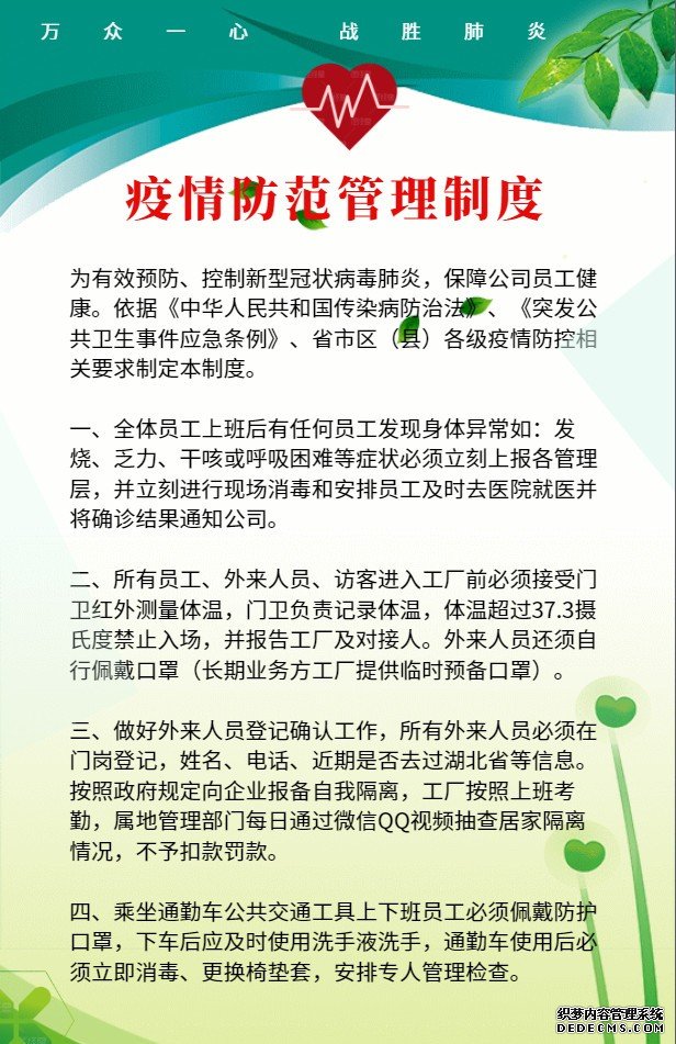 當(dāng)前,新型冠狀病毒感染的肺炎疫情嚴(yán)重威脅人民群眾身體健康和生命安全,特別是節(jié)后工業(yè)企業(yè)陸續(xù)復(fù)工復(fù)產(chǎn),容易形成人員集聚,疫情防控形勢緊迫,責(zé)任重大。企業(yè)必須做好節(jié)后復(fù)工復(fù)產(chǎn)疫情防控工作。