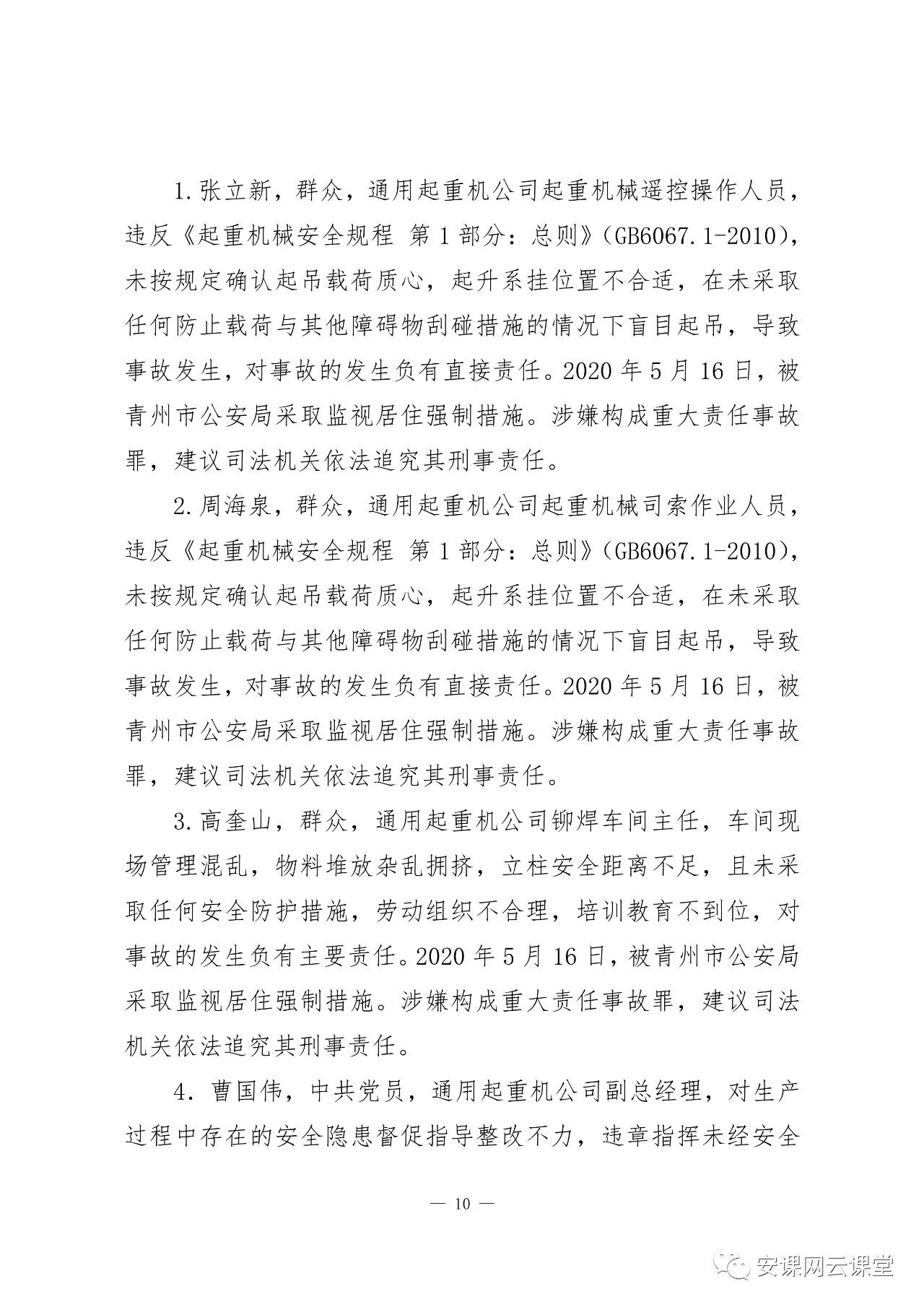 曹?chē)?guó)偉,中共黨員,通用起重機(jī)公司副總經(jīng)理,對(duì)生產(chǎn)過(guò)程中存在的安全隱患督促指導(dǎo)整改不力,違章指揮未經(jīng)安全教育培訓(xùn)的工人上崗作業(yè),對(duì)事故的發(fā)生負(fù)有主要責(zé)任。