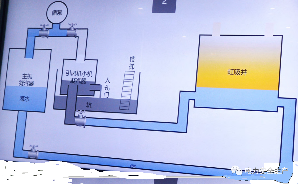 15:30檢修部丁某和安潔公司楊某某配合運(yùn)行操作人員光某關(guān)閉#4機(jī)組循環(huán)水系統(tǒng)母管排氣手動(dòng)門,系統(tǒng)注水排氣完成。運(yùn)行部陳某某從汽動(dòng)引風(fēng)機(jī)小機(jī)凝汽器區(qū)域離開回集控室。安潔公司楊某某詢問丁某,在確認(rèn)#4機(jī)組循環(huán)水系統(tǒng)啟動(dòng)已完成后,離開循環(huán)水母管排氣門區(qū)域。