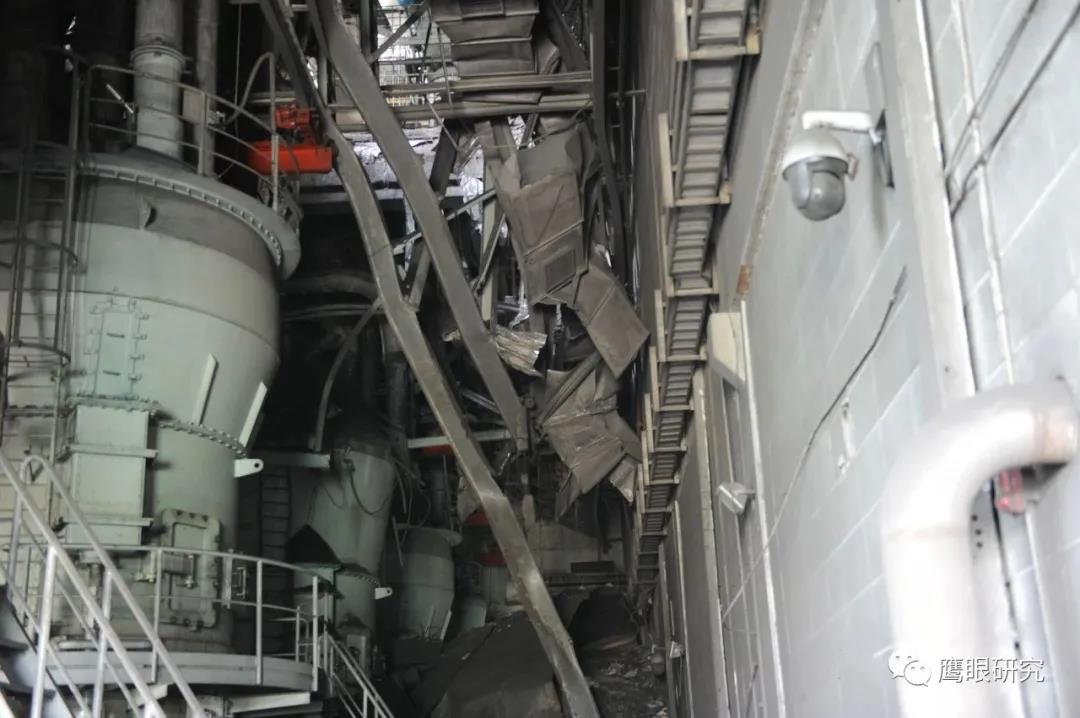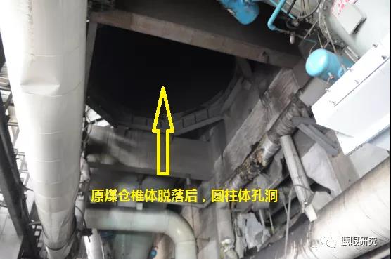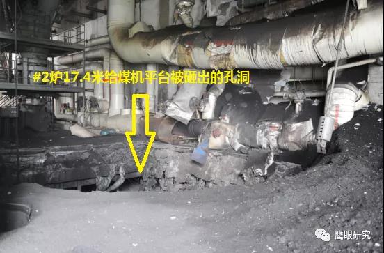 現(xiàn)場檢查,#2爐2D原煤倉下部錐體部脫落,砸壞2D給煤機(jī)平臺,連同給煤機(jī)墜落至#2鍋爐零米,2D給煤機(jī)損壞、2C、2D磨煤機(jī)油站、2D磨煤機(jī)、給煤機(jī)附近區(qū)域電纜、輔汽聯(lián)箱管道等設(shè)備不同程度受損,無人員傷害及主設(shè)備損壞。(堵煤次數(shù)太多,敲塌了?)